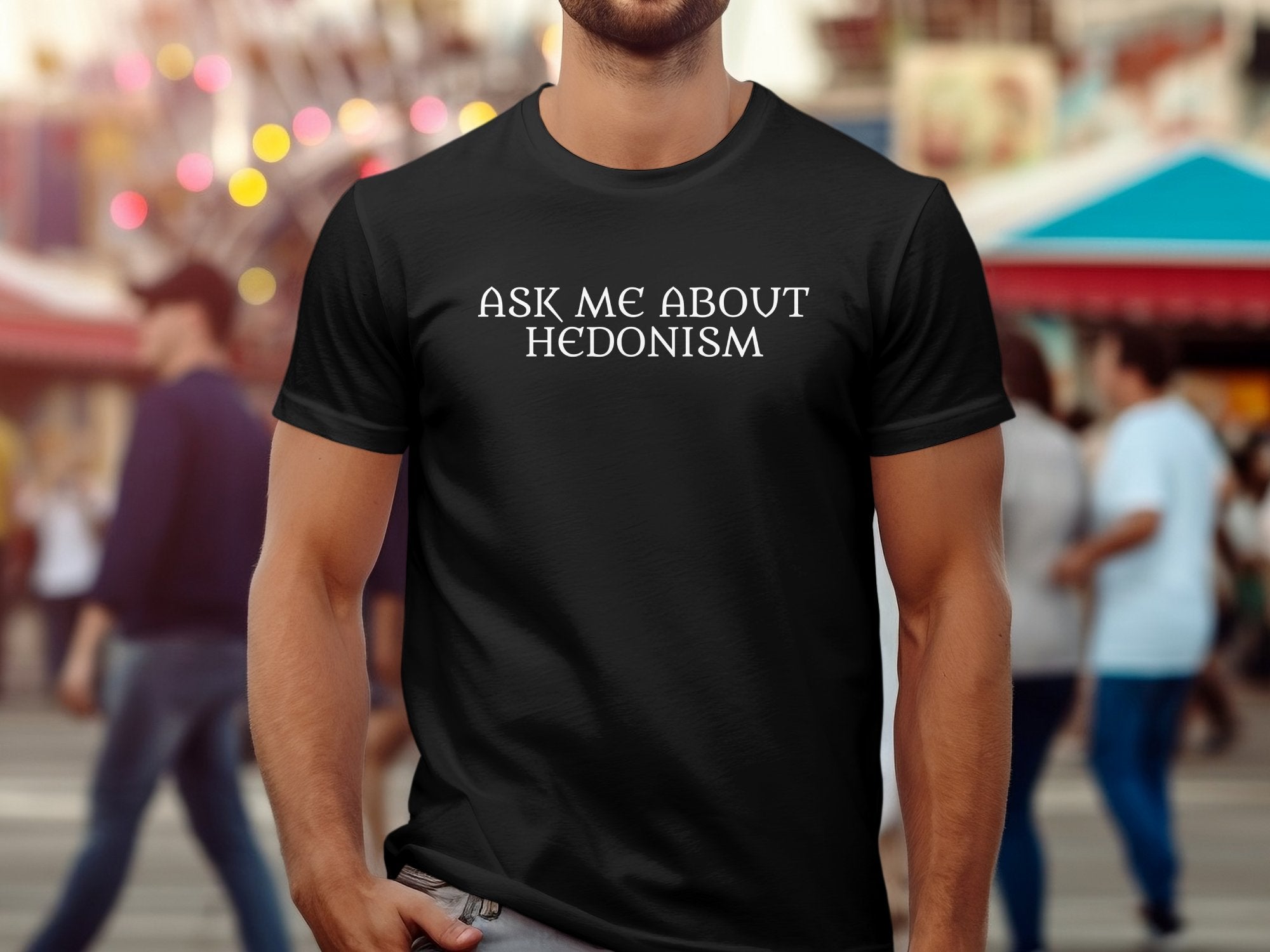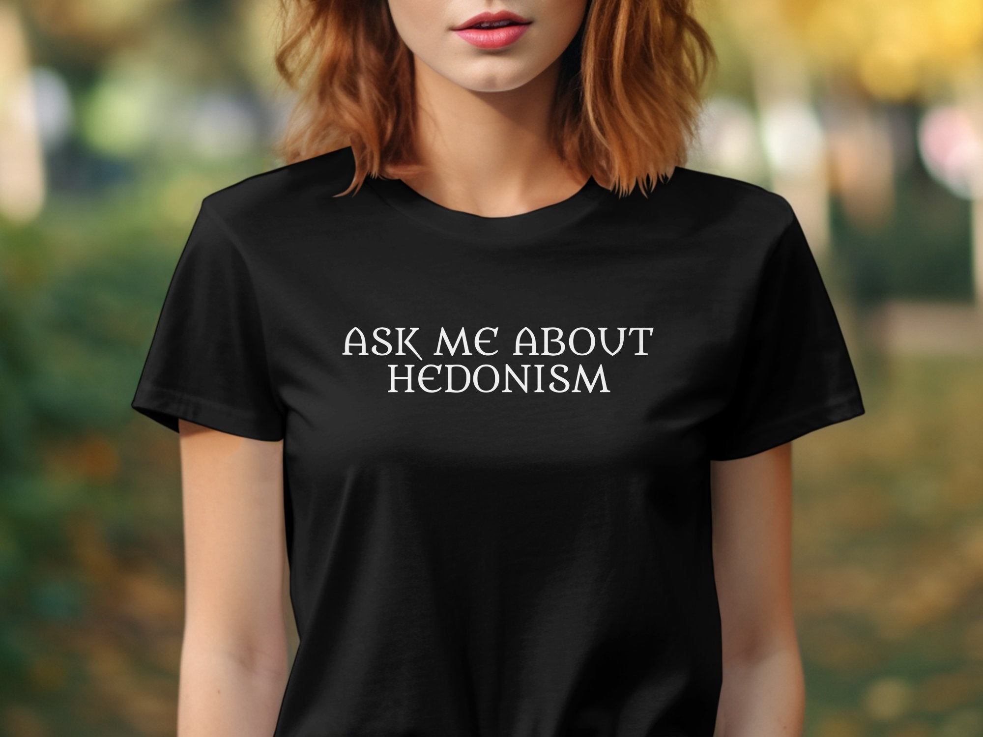 Unleash your indulgent side with our "Ask Me About Hedonism" t-shirt. This sleek black tee with bold white text is perfect for anyone who celebrates the finer things in life and isn't afraid to dive deep into the philosophy of pleasure. Ideal for lively discussions at parties, philosophical meetups, or relaxing days spent lounging in the park, it invites others to explore the idea that happiness might just be the highest good. Whether you're a student of Epicurean delights or a modern-day sybarite, this shirt is a stylish nod to your enjoyment of life's pleasures. Wear it as a playful provocation, or gift it to the hedonist in your life who loves to discuss the art of living well.