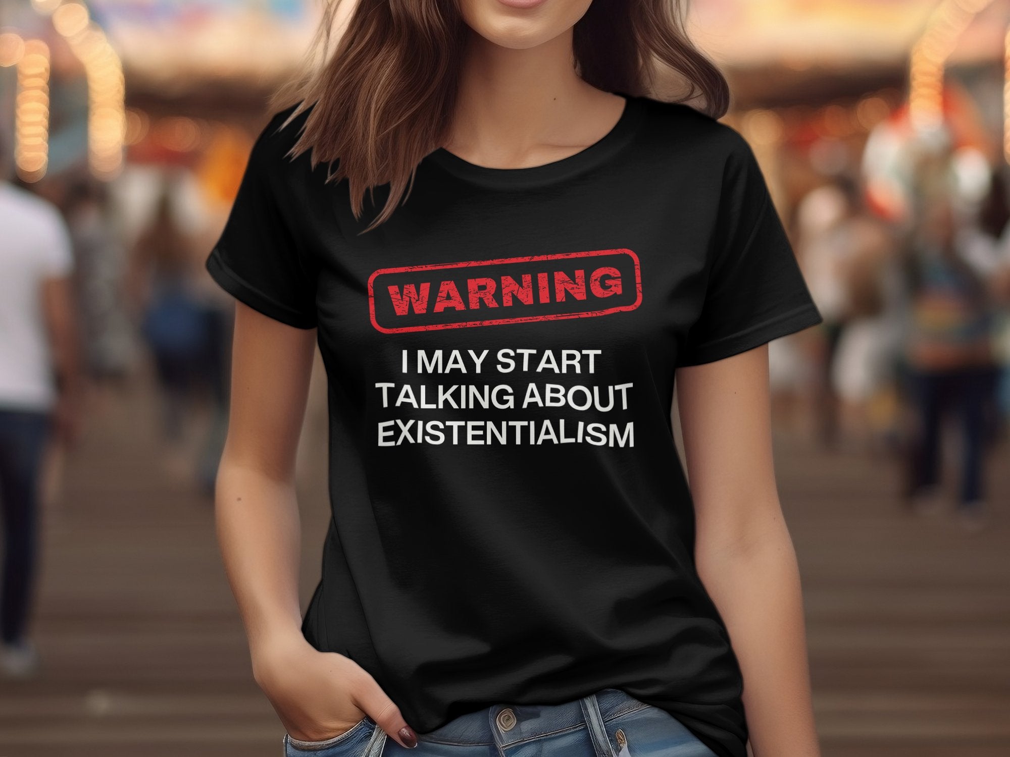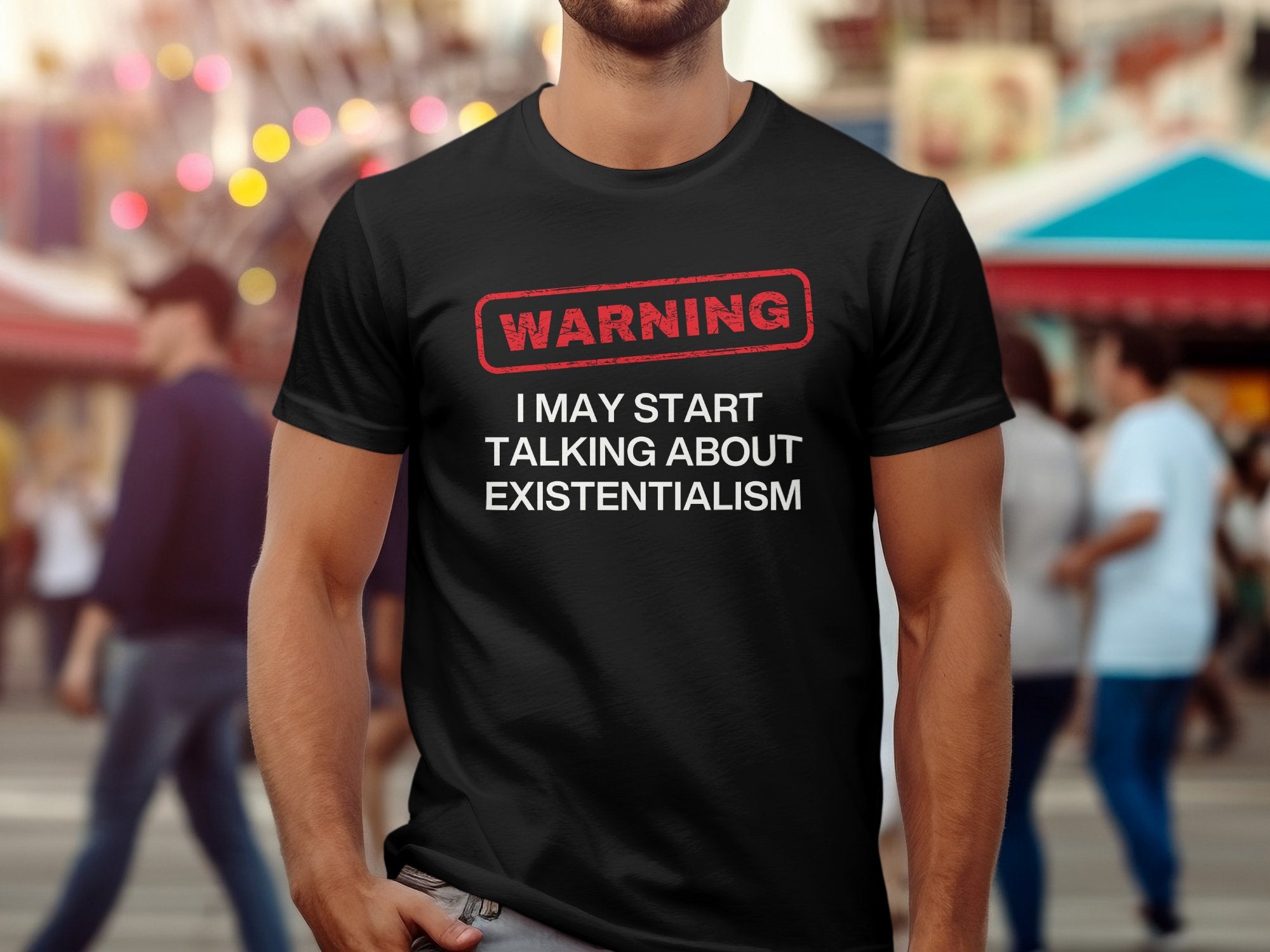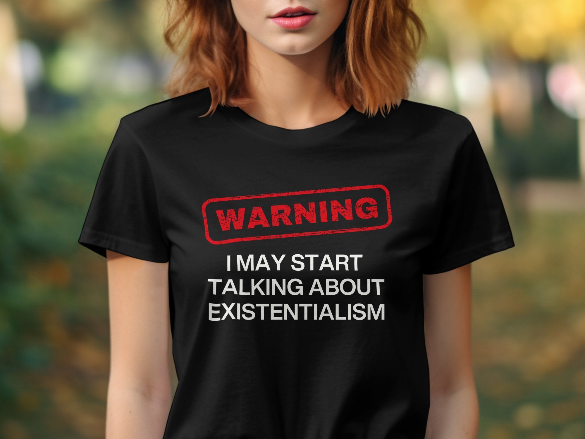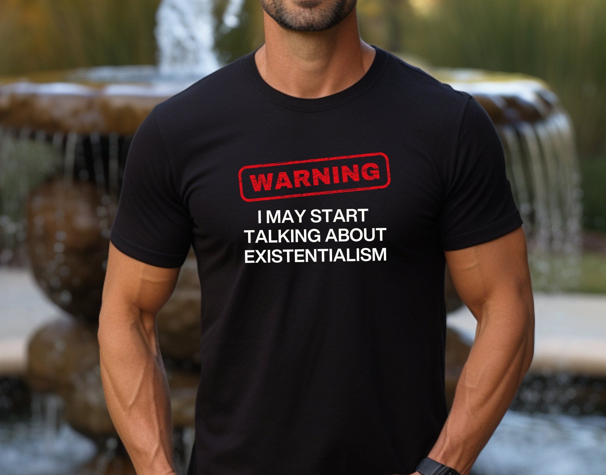 Venture into the depths of human existence with our captivating "Warning: I May Start Talking About Existentialism" t-shirt. This compelling garment is designed for those who are intrigued by the philosophical inquiry into the nature of existence, freedom, and choice. Perfect for existentialists, philosophers, and anyone who ponders the meaning of life, personal responsibility, and the essence of being. This shirt is an ode to the courage it takes to face the absurdity of life head-on and to forge one's path with authenticity and integrity.