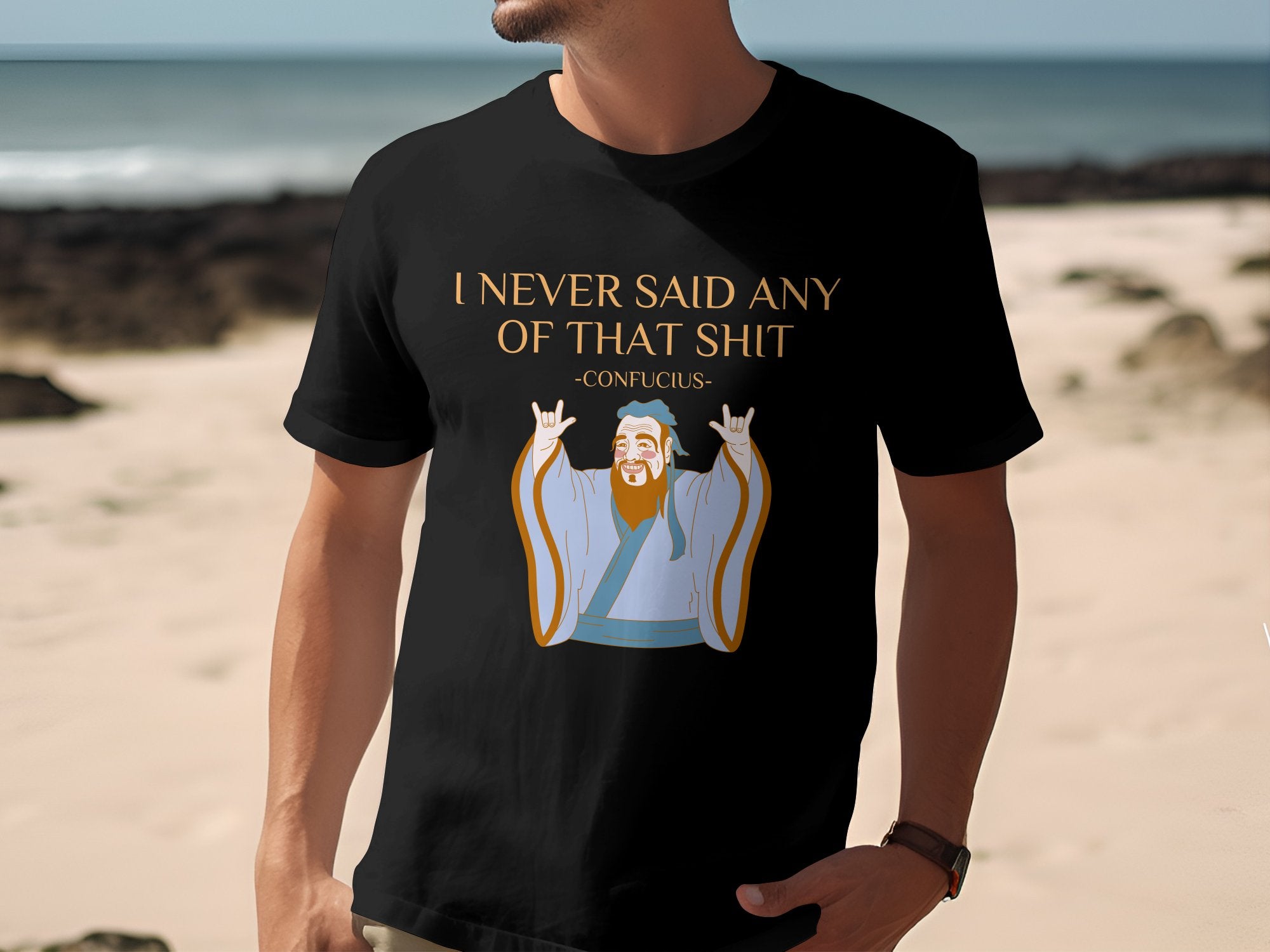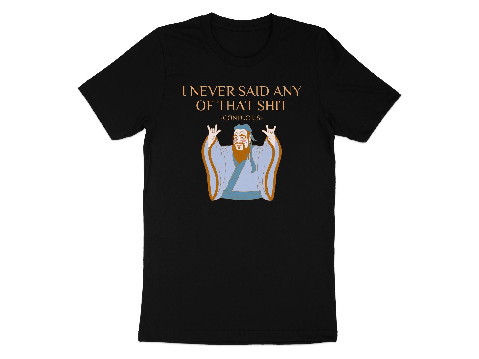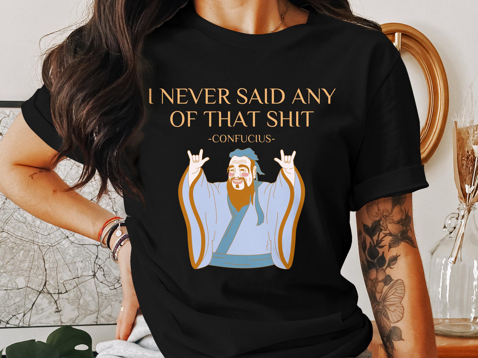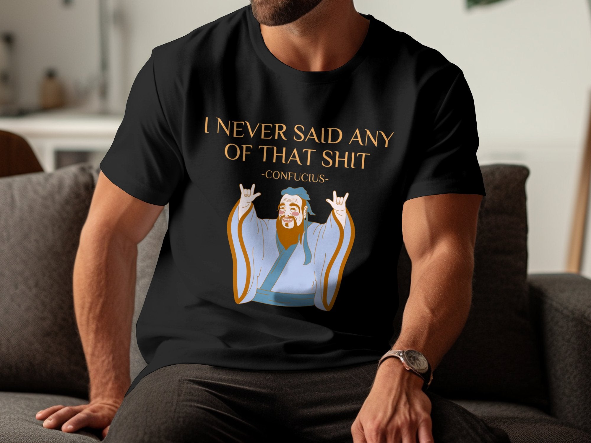 Add a dash of historical humor to your wardrobe with this cheeky t-shirt featuring a playful depiction of Confucius saying, "I NEVER SAID ANY OF THAT SHIT." Perfect for those who appreciate a good twist on classical wisdom, this shirt features the ancient philosopher throwing up the peace sign, humorously disowning the myriad of quotes often misattributed to him. Whether you're a student of philosophy, a lover of clever jokes, or just someone who likes to keep their historical figures in check, this t-shirt is sure to spark laughter and light-hearted debates. Wear it to your next class, a casual outing, or while lounging at home and enjoy being both stylish and intellectually provocative.