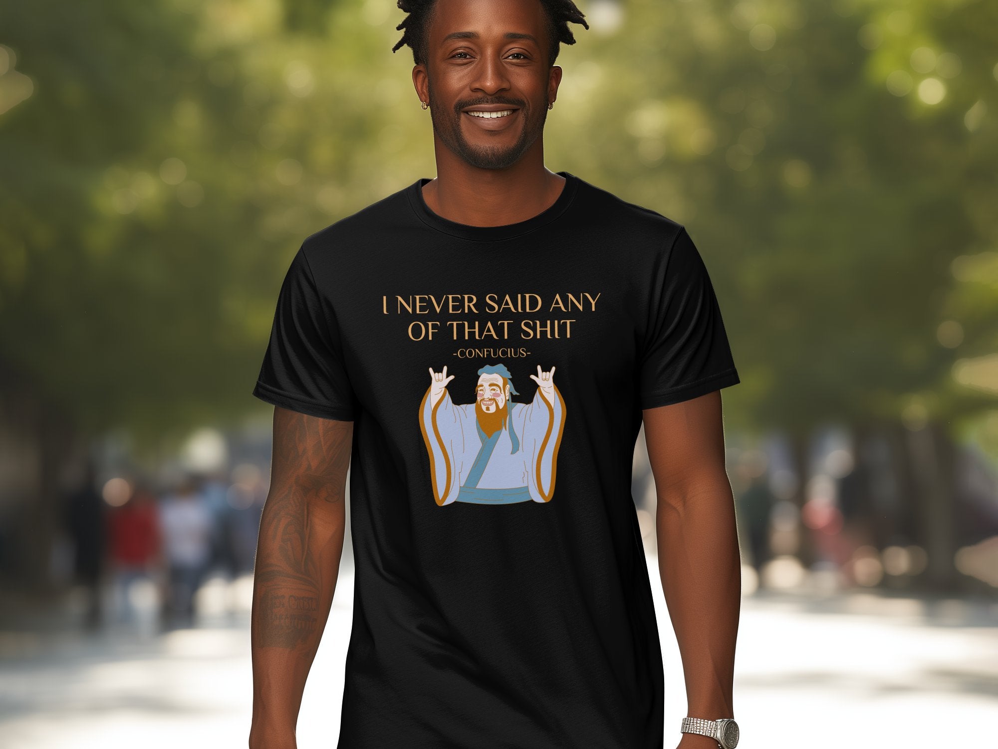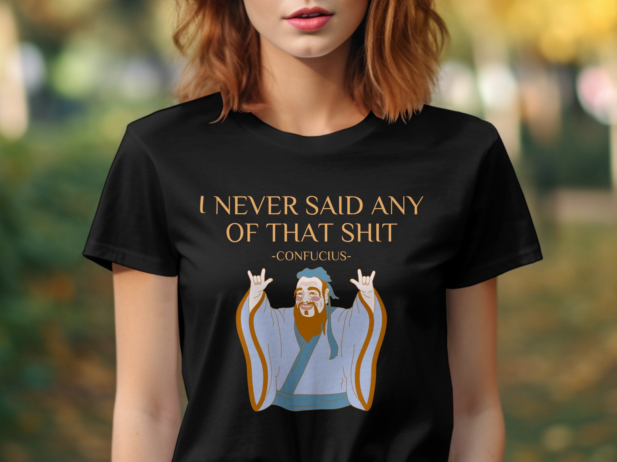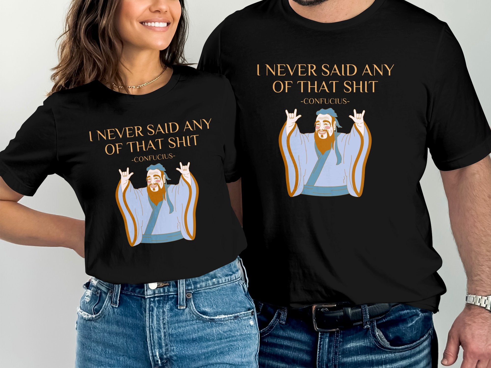 Add a dash of historical humor to your wardrobe with this cheeky t-shirt featuring a playful depiction of Confucius saying, "I NEVER SAID ANY OF THAT SHIT." Perfect for those who appreciate a good twist on classical wisdom, this shirt features the ancient philosopher throwing up the peace sign, humorously disowning the myriad of quotes often misattributed to him. Whether you're a student of philosophy, a lover of clever jokes, or just someone who likes to keep their historical figures in check, this t-shirt is sure to spark laughter and light-hearted debates. Wear it to your next class, a casual outing, or while lounging at home and enjoy being both stylish and intellectually provocative.