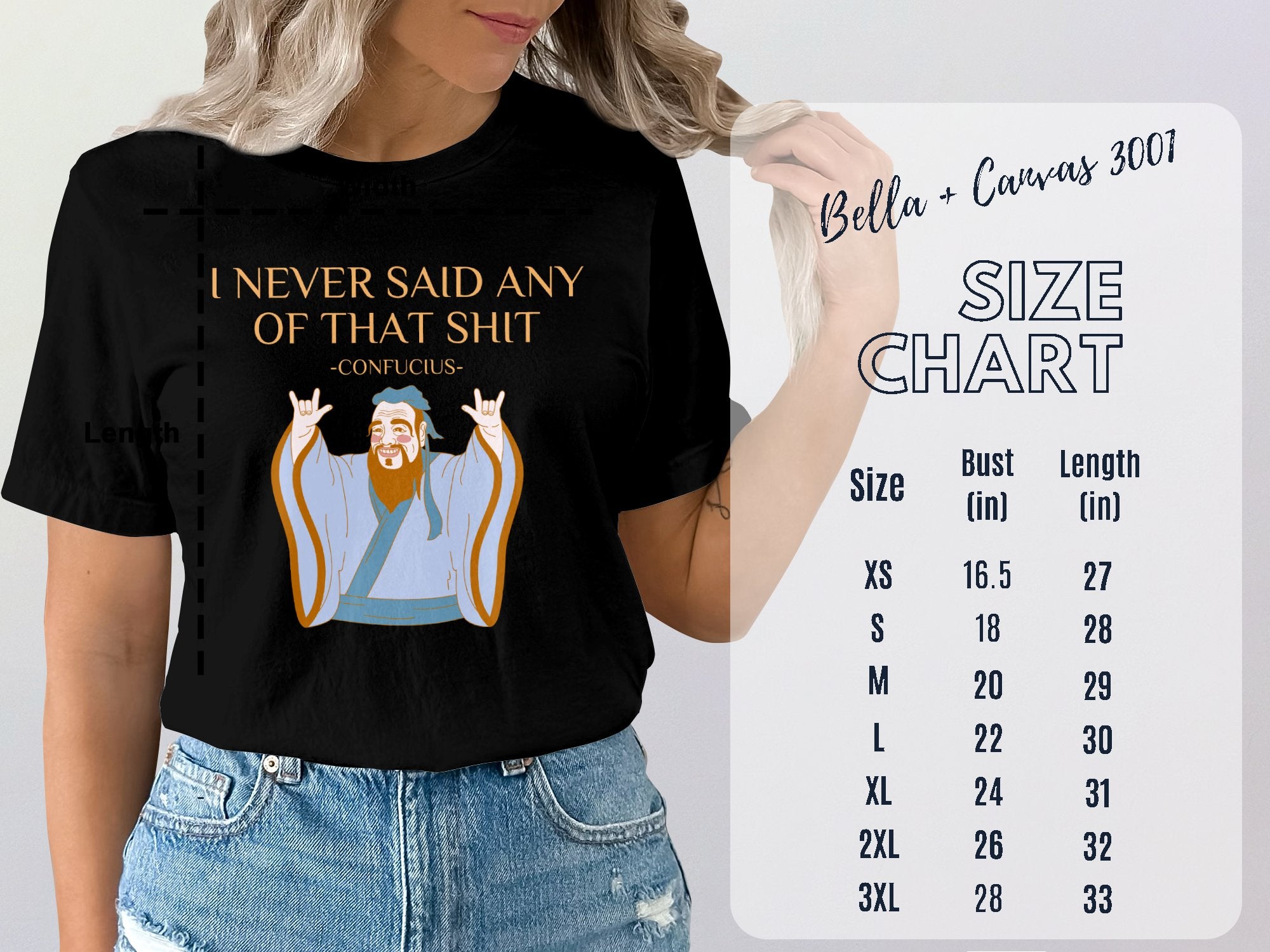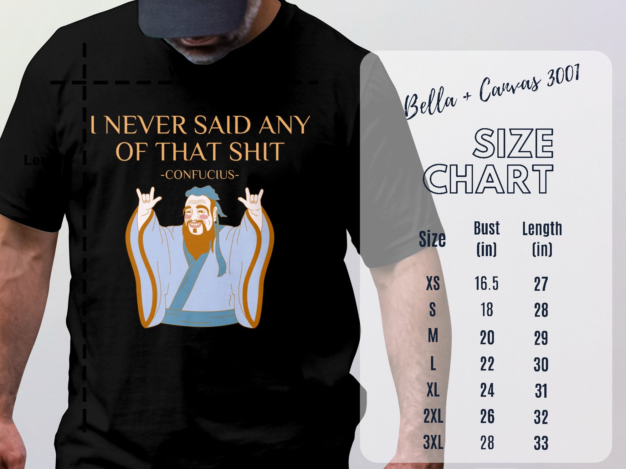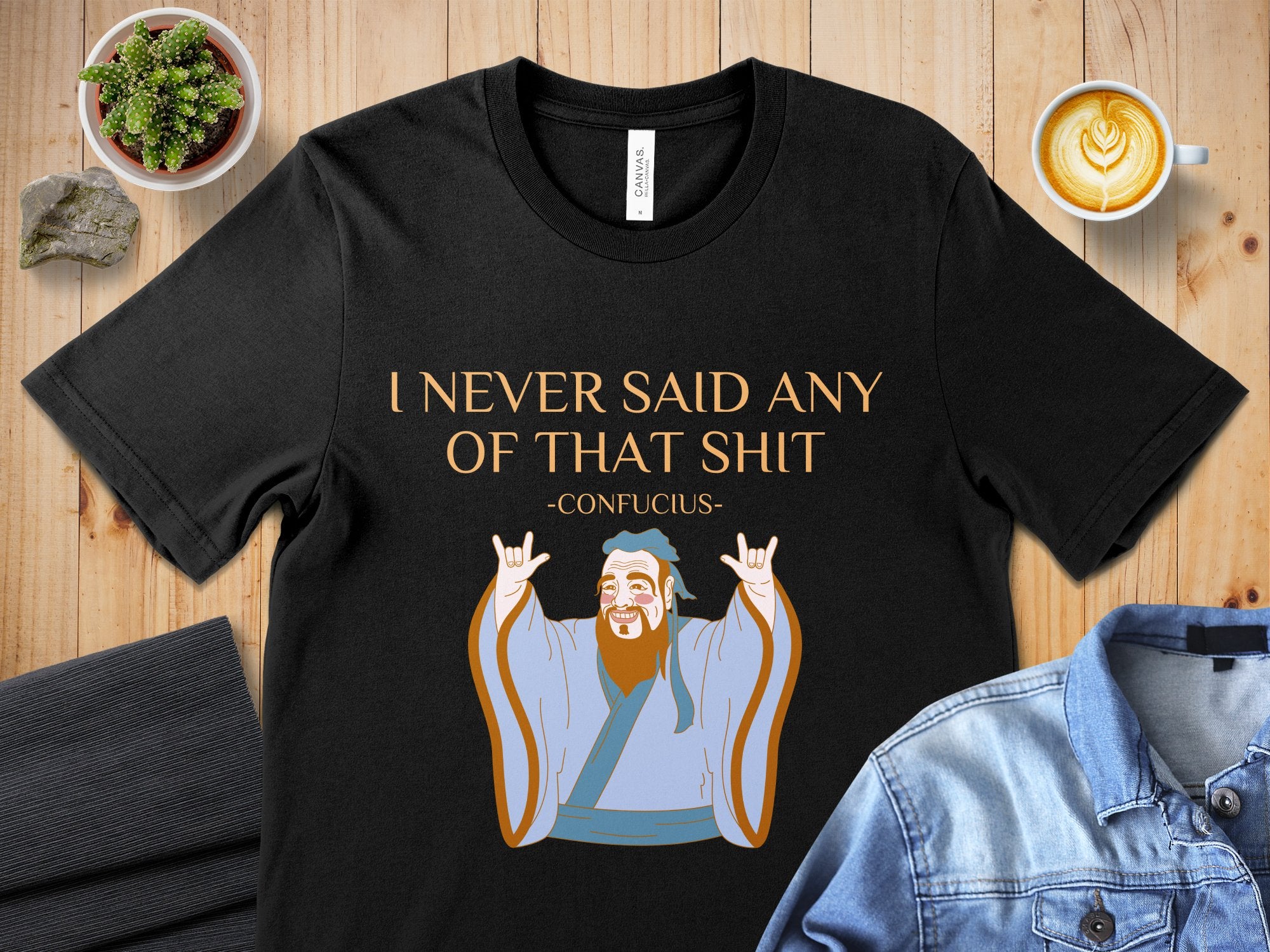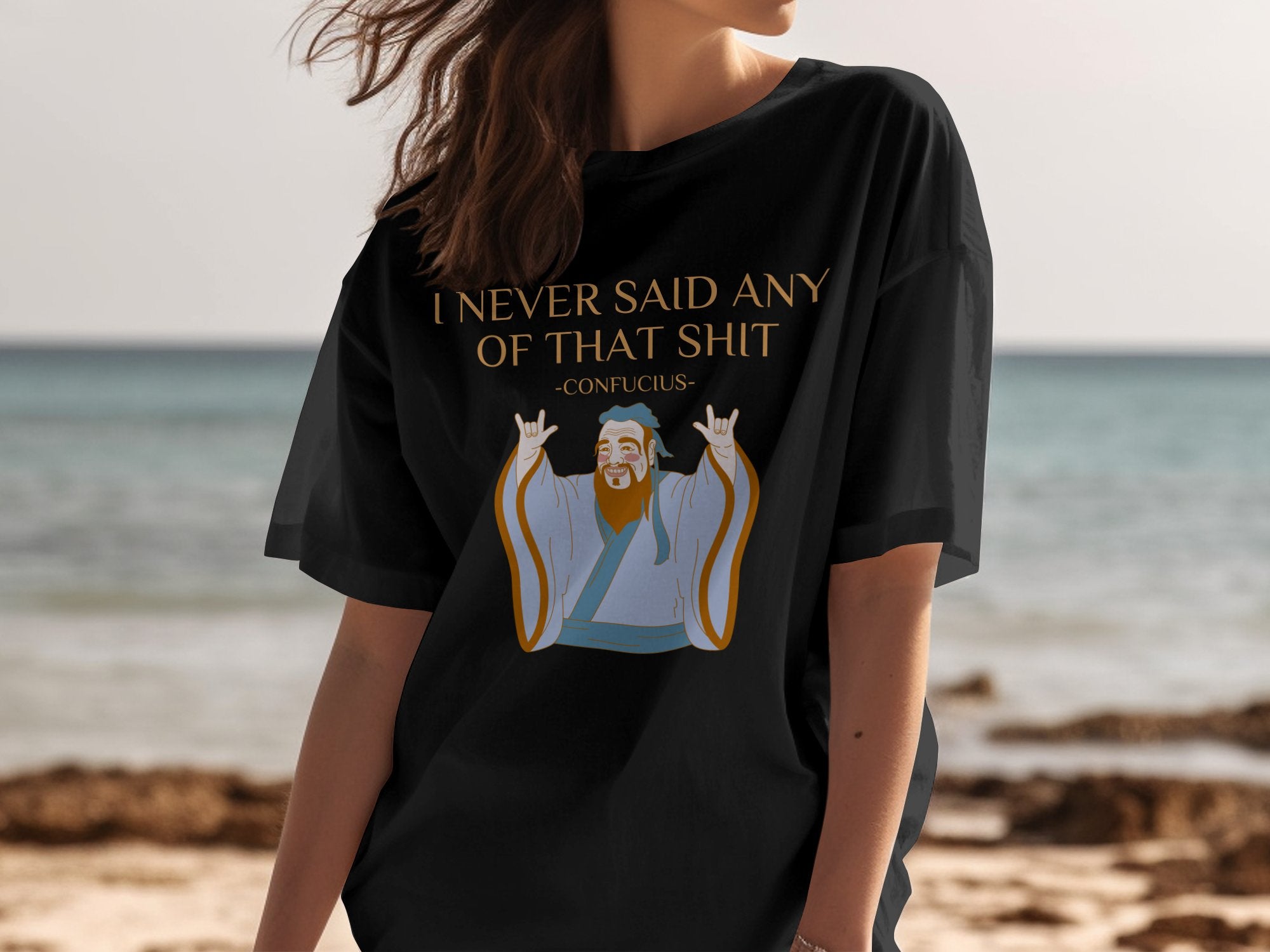 Add a dash of historical humor to your wardrobe with this cheeky t-shirt featuring a playful depiction of Confucius saying, "I NEVER SAID ANY OF THAT SHIT." Perfect for those who appreciate a good twist on classical wisdom, this shirt features the ancient philosopher throwing up the peace sign, humorously disowning the myriad of quotes often misattributed to him. Whether you're a student of philosophy, a lover of clever jokes, or just someone who likes to keep their historical figures in check, this t-shirt is sure to spark laughter and light-hearted debates. Wear it to your next class, a casual outing, or while lounging at home and enjoy being both stylish and intellectually provocative.