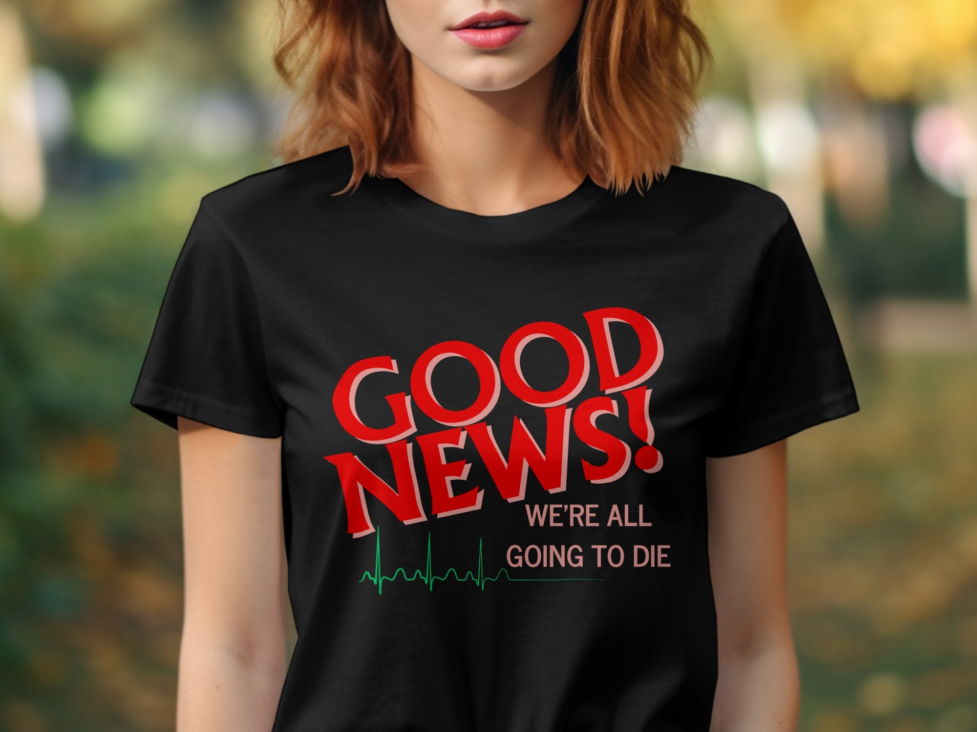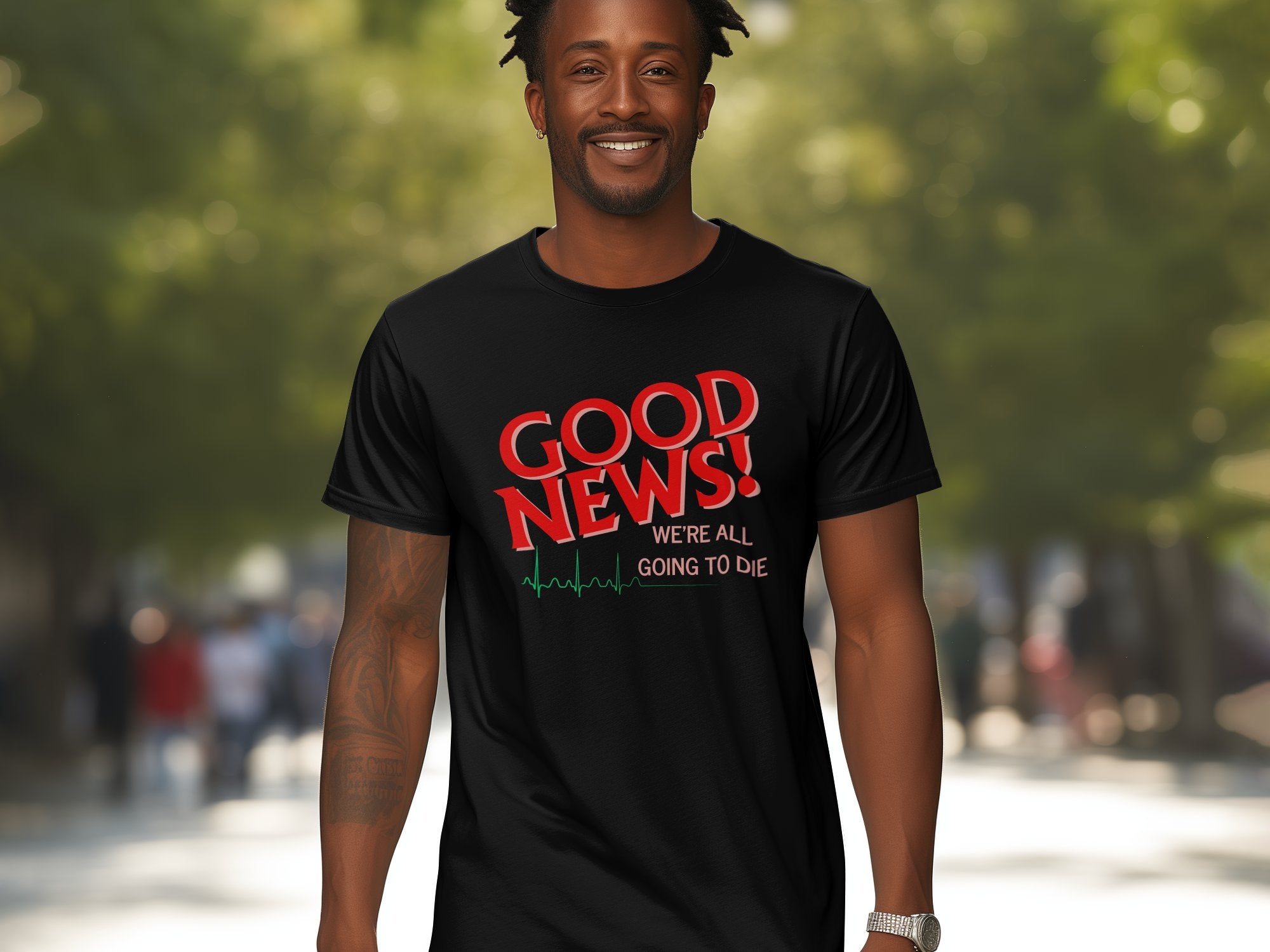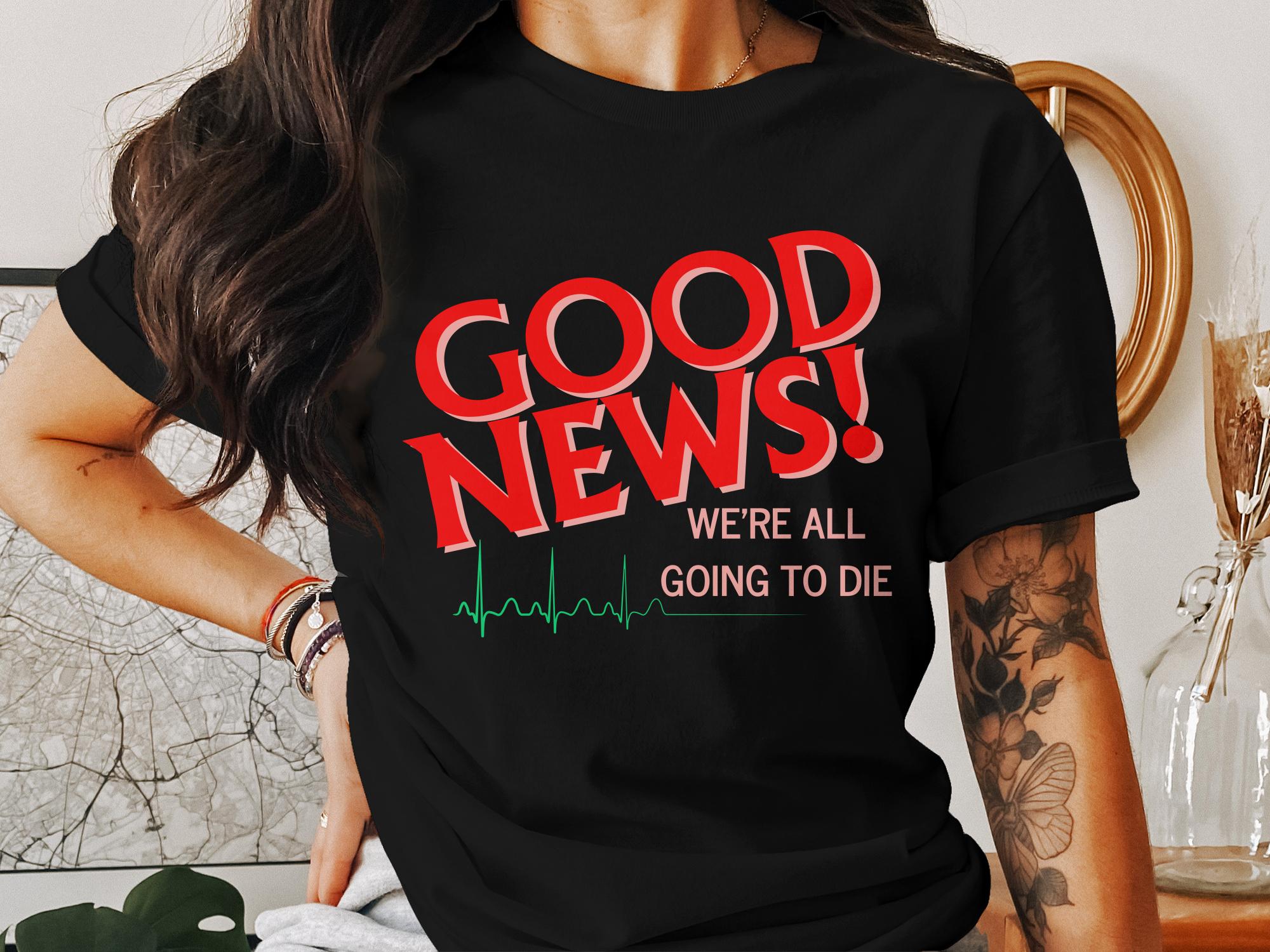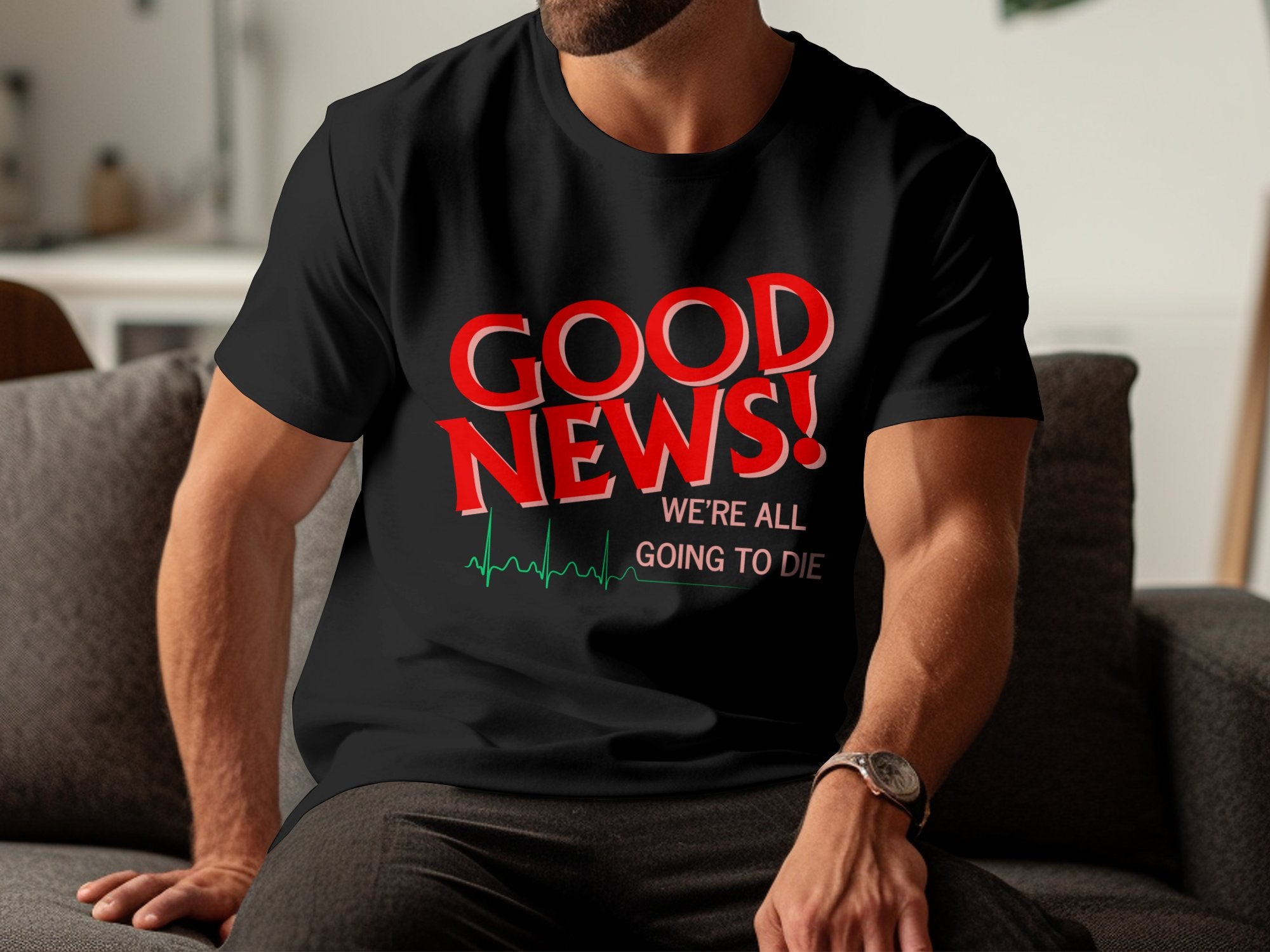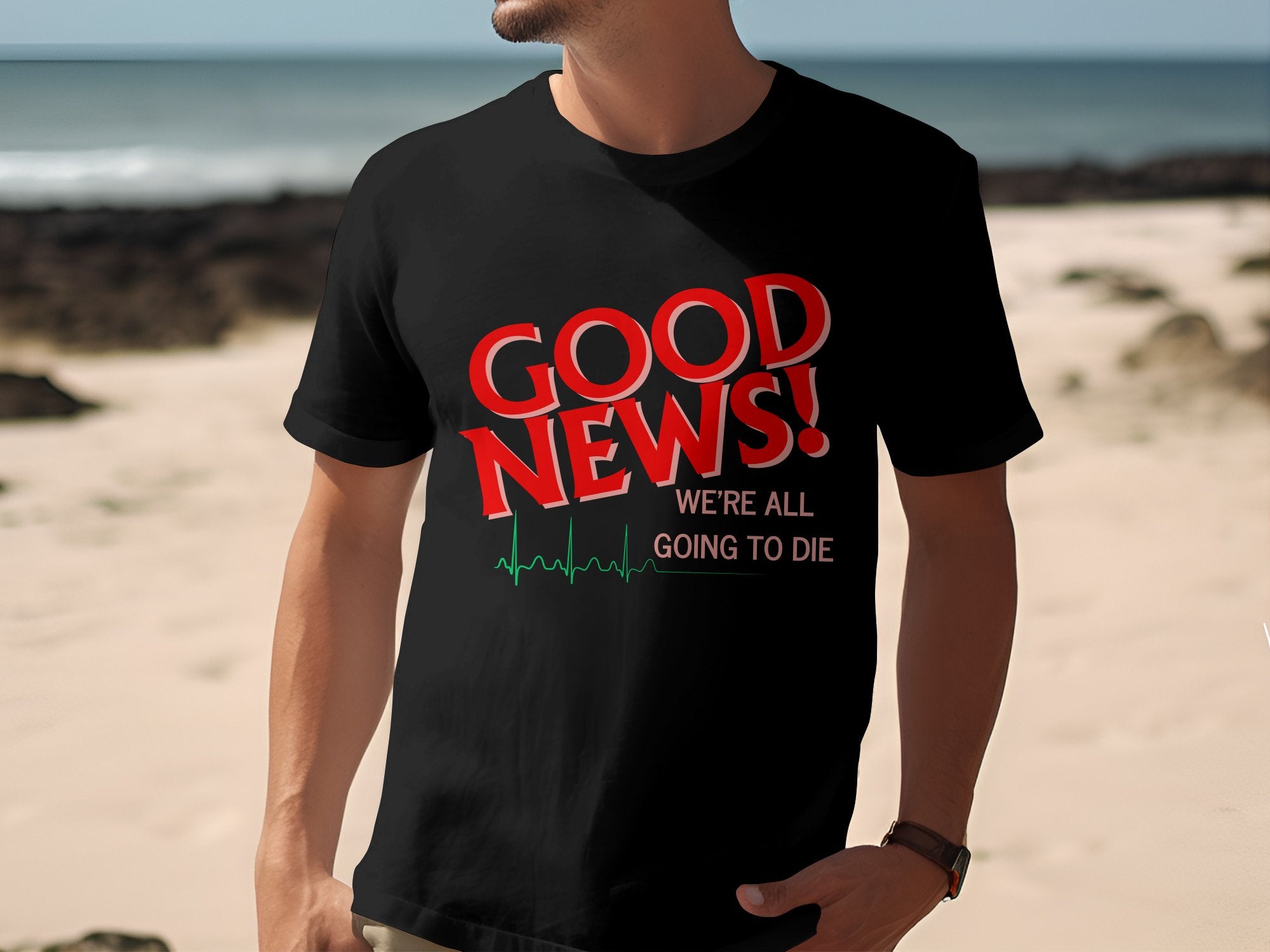 Inject a dose of dark humor into your wardrobe with this bold t-shirt that proclaims, "GOOD NEWS! We're all going to die." This shirt playfully tackles the existential certainty with a bright and bold design that can't help but draw smiles and raised eyebrows. Perfect for those who appreciate a philosophical jest or just want to lighten up the heavier discussions of life's inevitable end. Ideal for wearing to casual gatherings, philosophical debates, or when you just feel like making a statement. This t-shirt is a humorous reminder to not take life too seriously—after all, none of us are getting out alive!