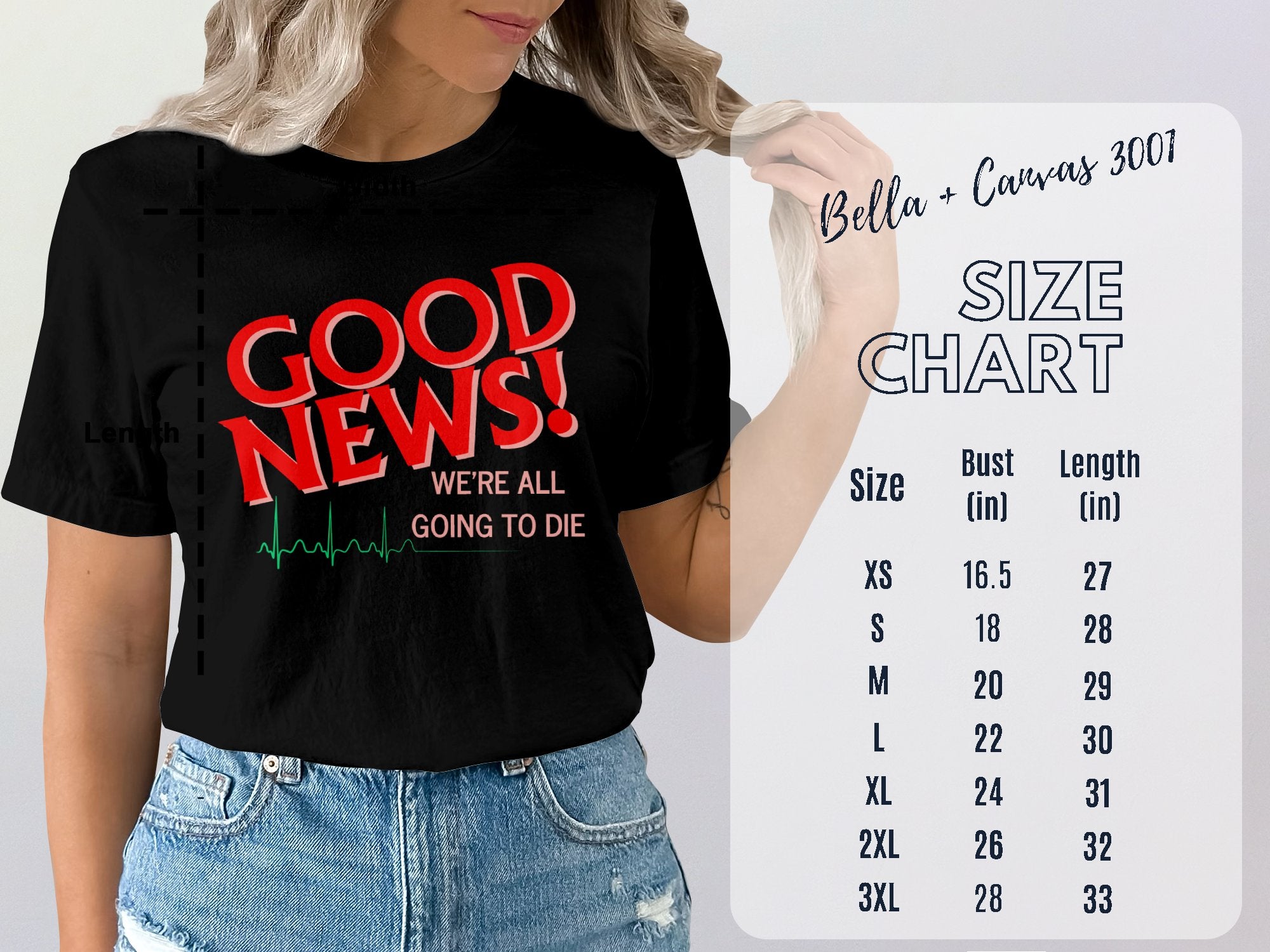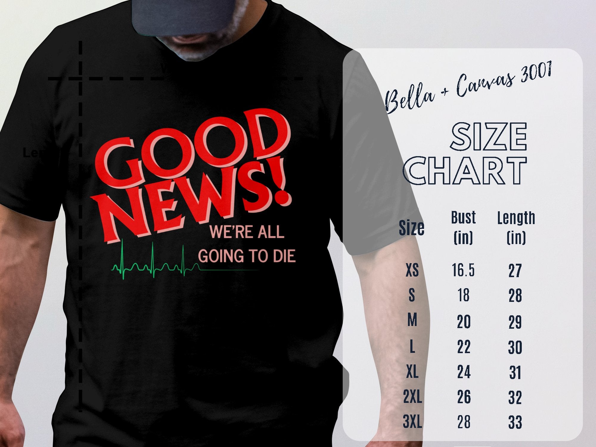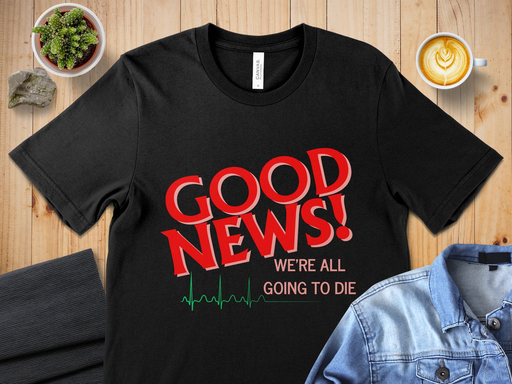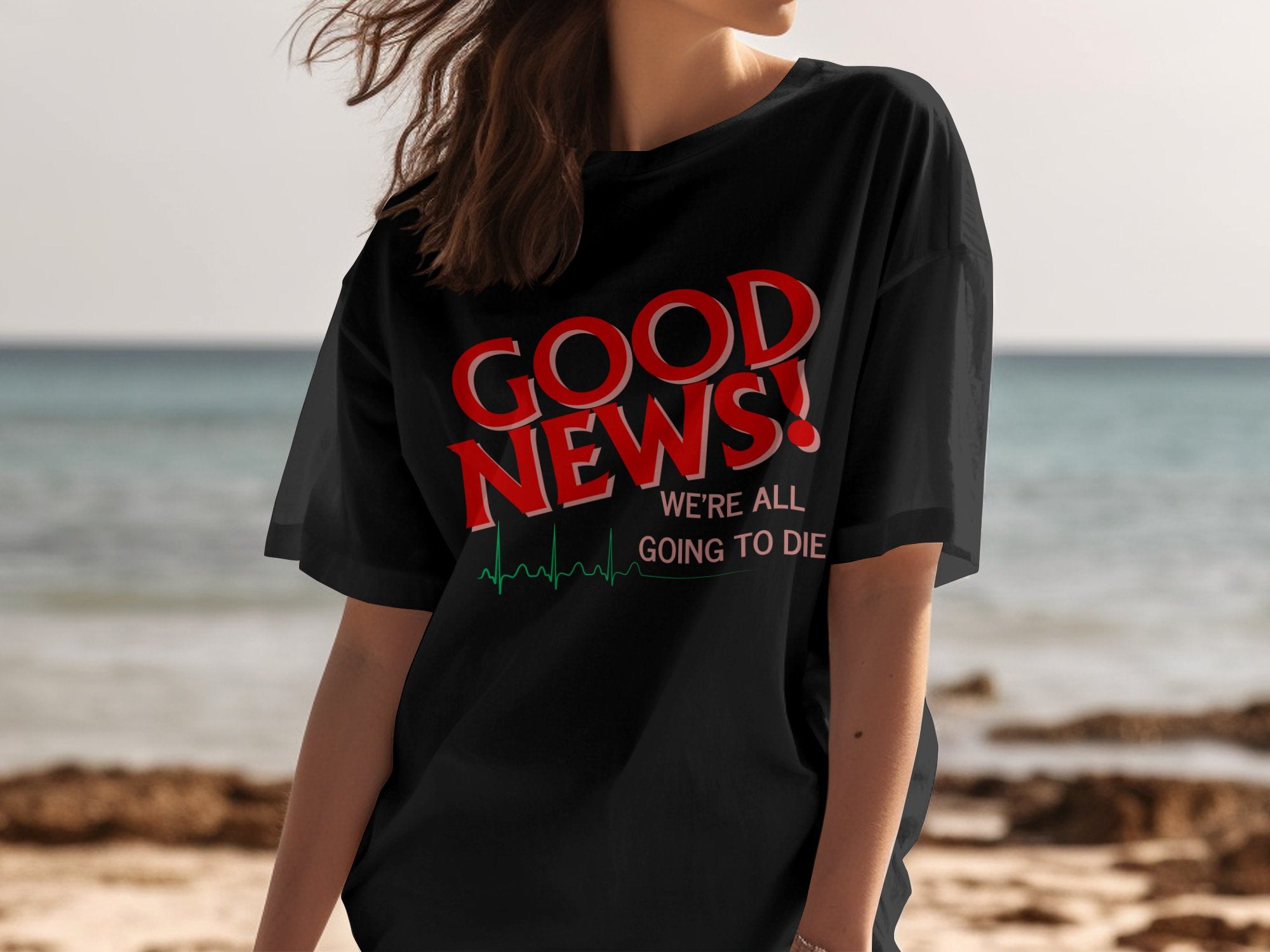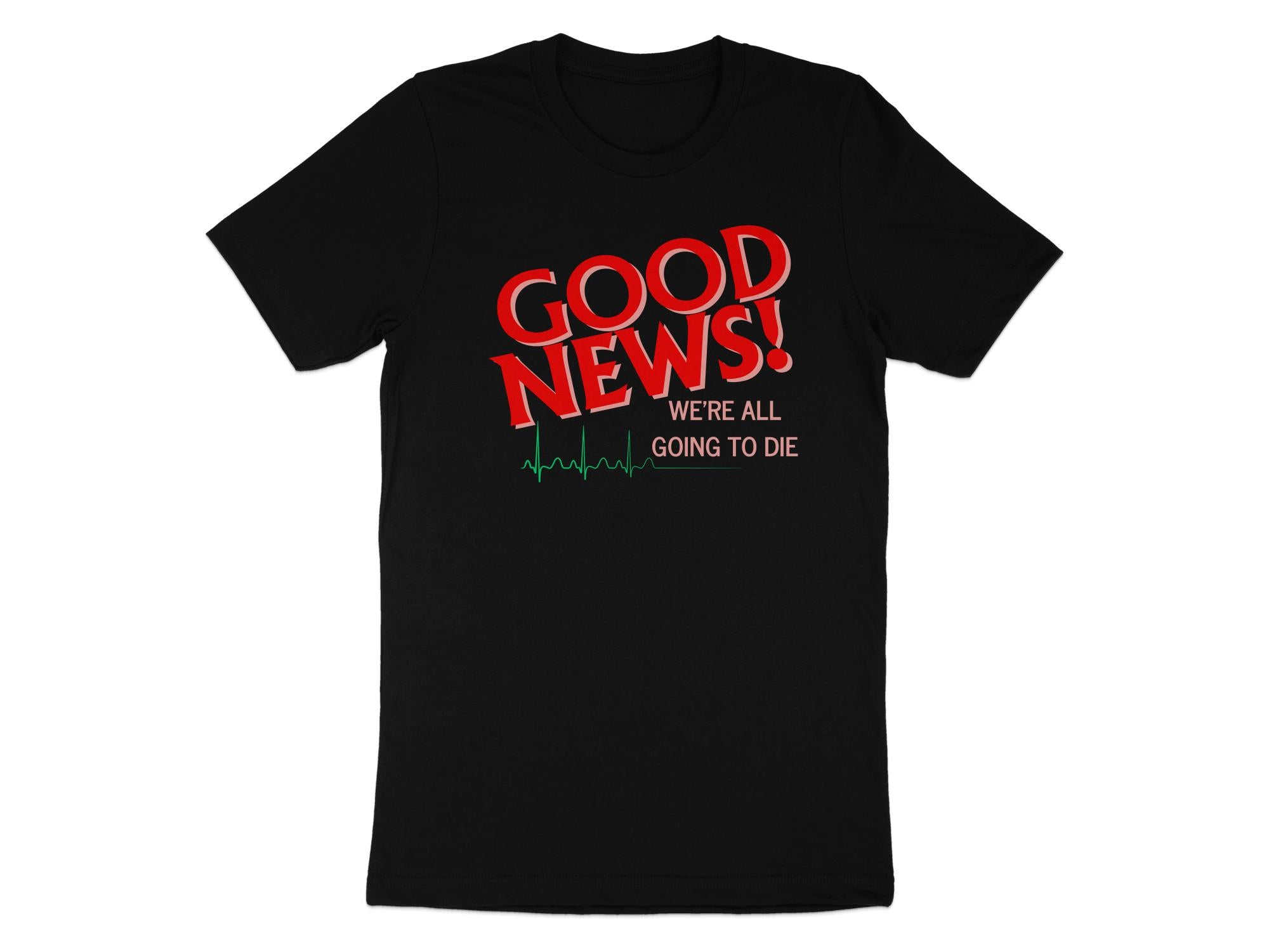Inject a dose of dark humor into your wardrobe with this bold t-shirt that proclaims, "GOOD NEWS! We're all going to die." This shirt playfully tackles the existential certainty with a bright and bold design that can't help but draw smiles and raised eyebrows. Perfect for those who appreciate a philosophical jest or just want to lighten up the heavier discussions of life's inevitable end. Ideal for wearing to casual gatherings, philosophical debates, or when you just feel like making a statement. This t-shirt is a humorous reminder to not take life too seriously—after all, none of us are getting out alive!